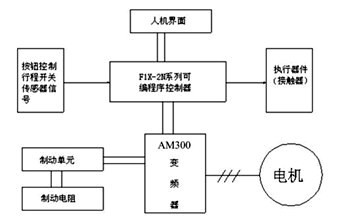 系統(tǒng)組成由人機界面,PLC,安邦信AMB300系列變頻器,制動單元,制動電阻。在整個系統(tǒng)中PLC和變頻器,觸摸屏均通過 RS-485 進行串行通訊。