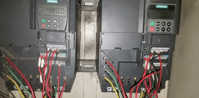 變頻器接線,將兩個變頻器分別定義為主機和從機,主機485A端口接入從機485A端口中,主機485B端口接入從機485B端口中。